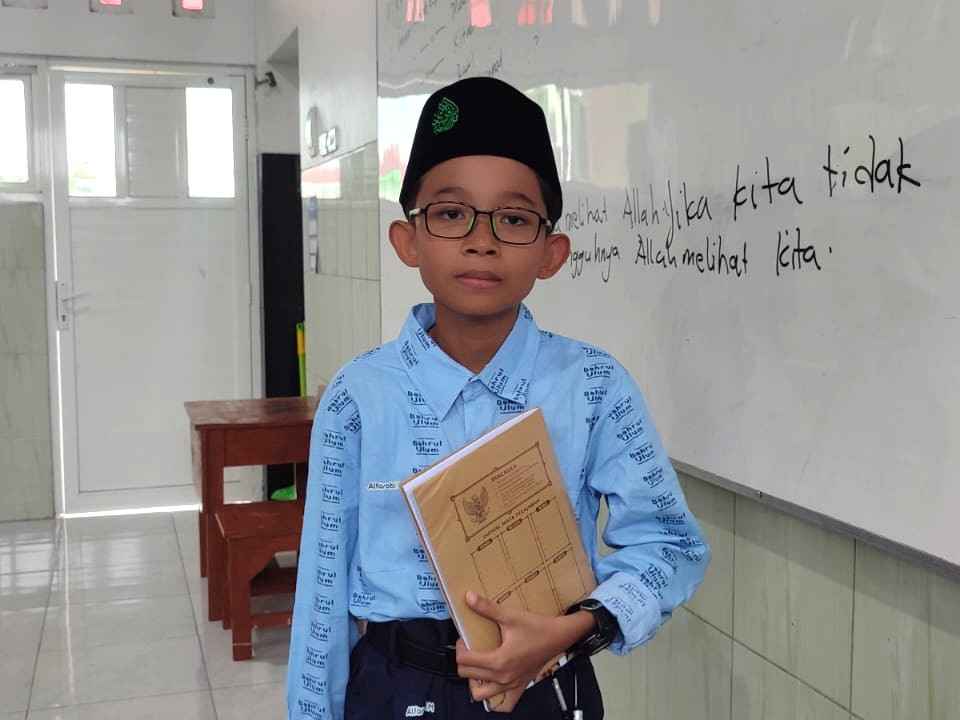 Alfarobi Hasan Masruri atau yang akrab disapa Alfaro, siswa kelas 1A asal Bekasi, tampak antusias mengikuti kegiatan pendalaman bahasa Arab dan bahasa Inggris yang dilaksanakan oleh Madrasah Muallimin Muallimat 6 Tahun Bahrul Ulum. Kegiatan ini rutin digelar setiap Sabtu hingga Senin, pukul 13.00 sampai 13.30 WIB, bertempat di Kampus 2.