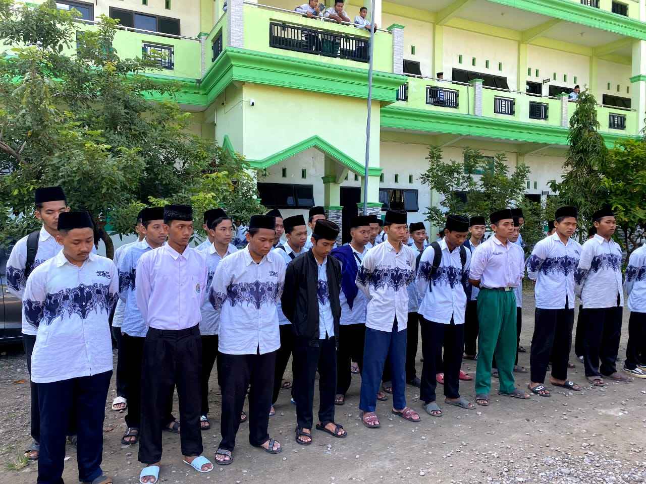 Sebelum berangkat, peserta melaksanakan apel untuk menerima pembekalan singkat terakhir dan doa di halaman Madrasah. Tampak sekitar 30-an peserta Baksos berbaris di depan Madrasah.