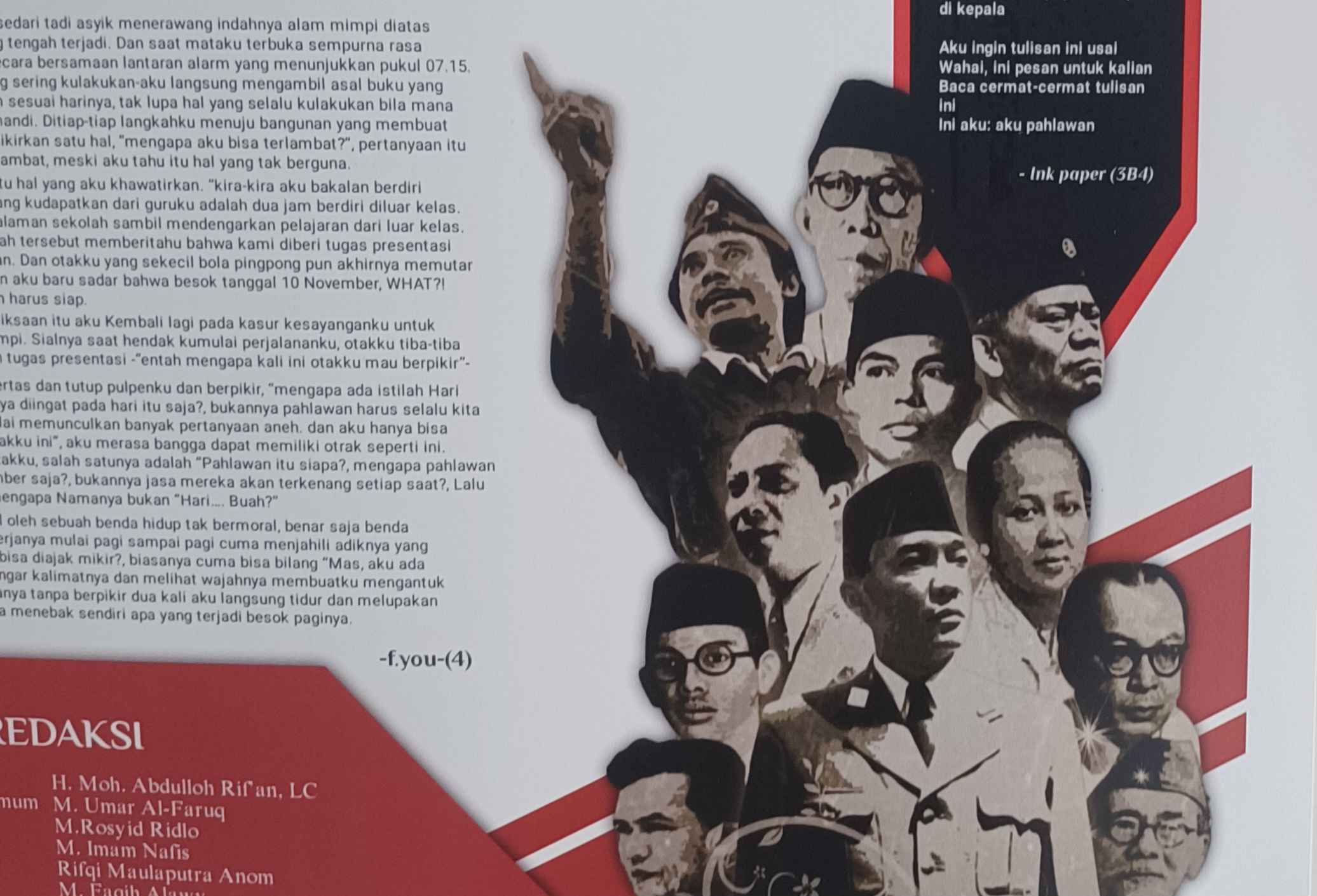 Diluar kelas kupandangi seluruh halaman sekolah sambil mendengarkan pelajaran dari luar kelas. Dan aku mendengarkan guru sejarah tersebut memberitahu bahwa kami diberi tugas presentasi perkelompok tentang hari pahlawan. Dan otakku yang sekecil bola pingpong pun akhirnya memutar ingatan tentang hari pahlawan. Dan aku baru sadar bahwa besok tanggal 10 November, WHAT?! Yang benar saja, besok kami sudah harus siap. Mungkin kebanyakan orang akan langsung teringat dengan peringatan "Hari Pahlawan". Hari Pahlawan identik dengan aksi heroik Bung Tomo dan arek-arek Surabaya pada tanggal
