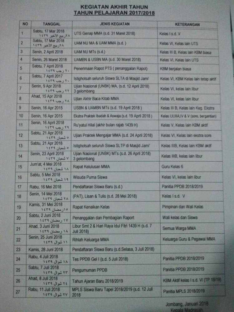 Rapat yang dipimpin Waka Kesiswaan, Bambang Hariadi, M.Pd, ini memutuskan jadwal kegiatan akhir tahun Madrasah, antara lain: Ujian Akhir Madrasah Nahdlatul Ulama (UAMNU), Ujian Akhir Madrasah, Ujian Nasional bagi kelas 6 dan kelas 3B; serta Ujian Praktek Mengajar dan Ujian Baca Kitab bagi kelas 6.