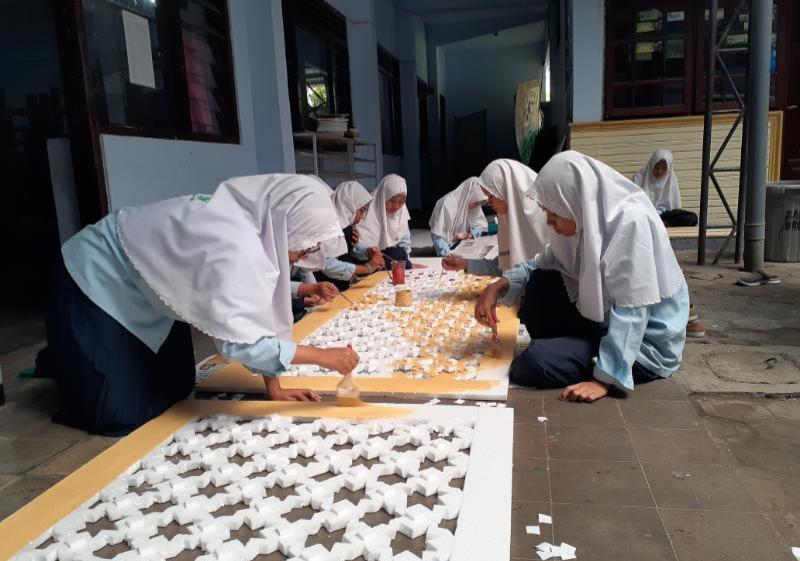 Setelah jam belajar sekolah tuntas mereka jalani, siang ini, Selasa (23/07), pukul 12.30 WIB, sekitar 9 (sembilan) orang siswi Madrasah Muallimin Muallimat 6 Tahun Bahrul Ulum, berada di selasar depan kelasnya, sibuk mengahadap lembaran styrofoam warna putih. Dengan cekatan, dipandu seorang siswi, yang rupanya didapuk sebagai desainernya, mereka melobangi styrofoam tersebut dengan pola bintang.