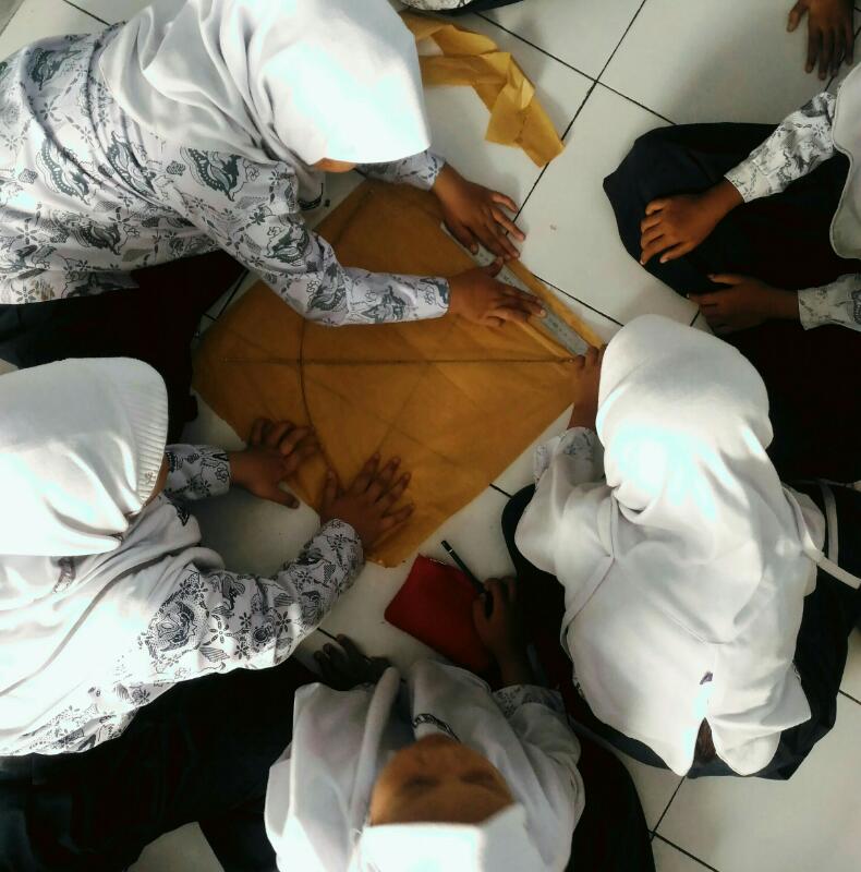 Azizah menyiapkan kerangka layang-layang dan kertas sampul beserta lem kertas sebagai alat peraga. Dengan alat peraga pembelajarannya tersebut, Azizah sedang mengampu mata pelajaran Seni, Budaya Dan Keterampilan (SBK).