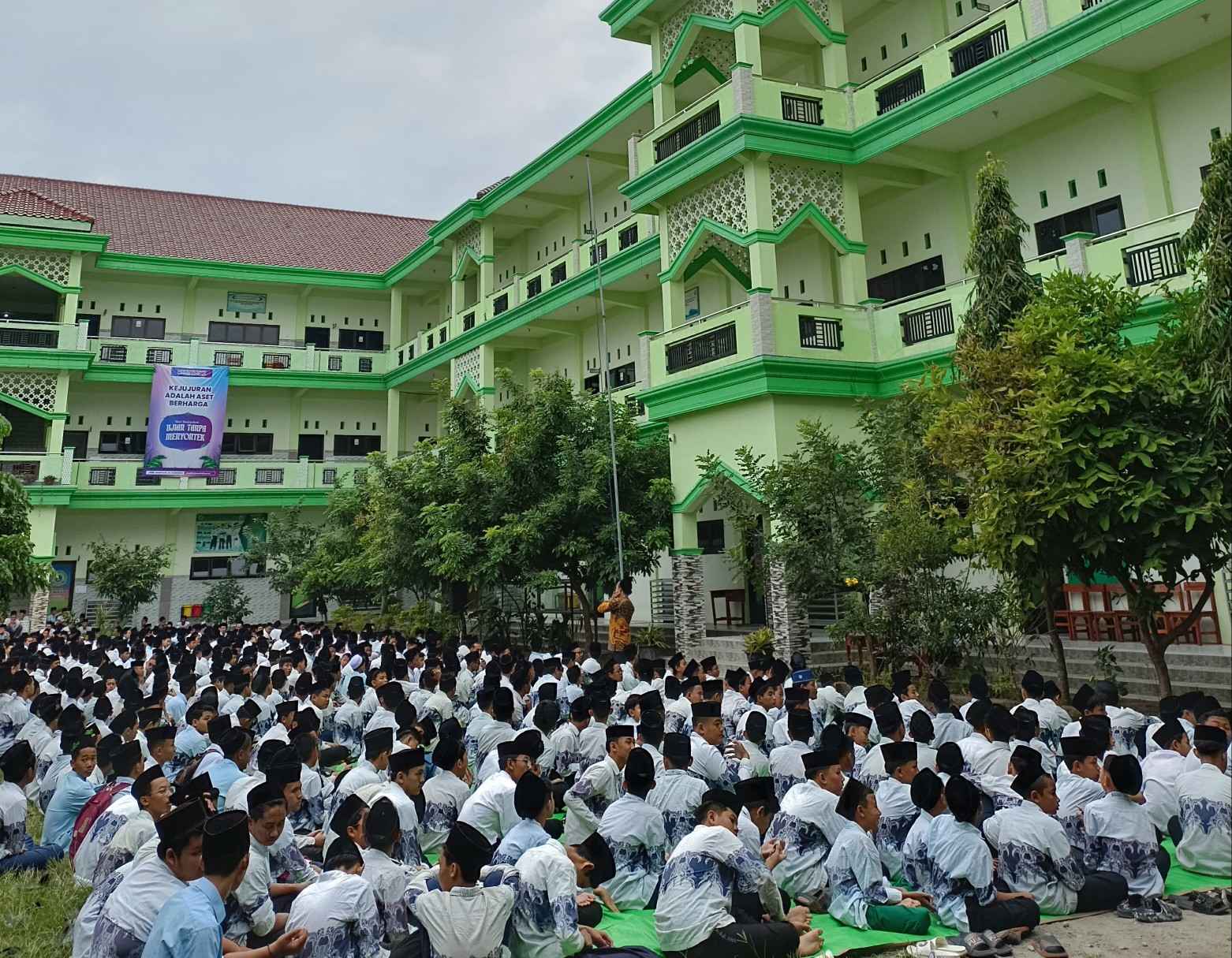 Semua yang duduk berjajar sambil bersila di atas hamparan terpal plastik tersebut adalah siswa Madrasah Muallimin Muallimat 6 Tahun Bahrul Ulum, yang tengah mengikuti apel akhir tahun setelah mengikuti PAT tahun ajaran 2023/2024.