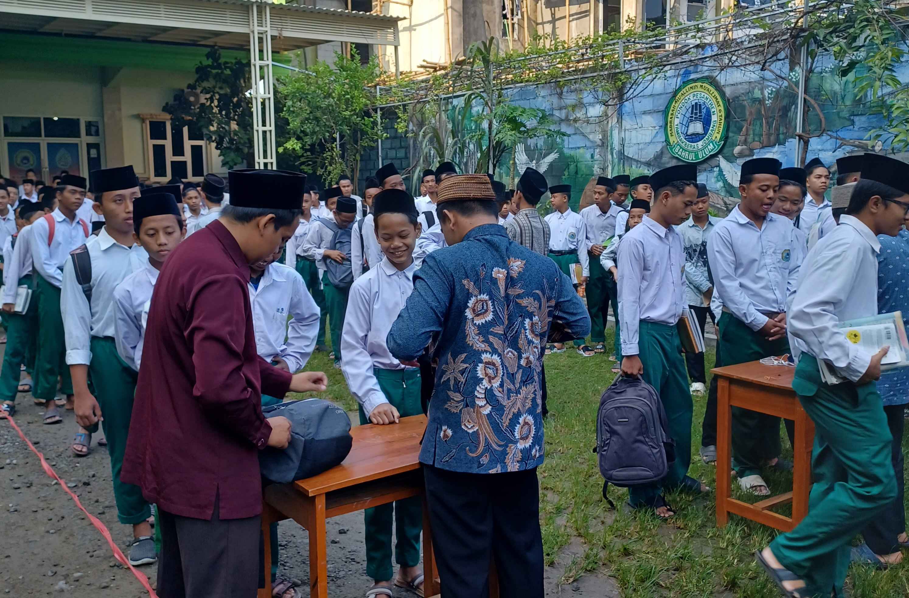 Tidak seperti biasanya. Siswa Madrasah Muallimin Muallimat Bahrul Ulum Tambakberas, begitu masuk komplek Madrasah, pada pagi ini, Selasa (20/02), tidak langsung menuju ruang kelas masing-masing. Mereka harus berbaris antri di halaman Madrasah sebelum masuk ke ruang kelas, melewati pemeriksaan yang dilakukan oleh Bidang Kesiswaan.