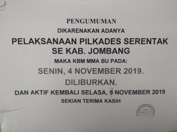 Turut Mensukseskan Pilkades Serentak Di Jombang Madrasah Diliburkan